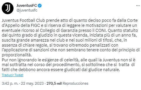 El club de Turín mostró su disconformidad tras la resolución y dejó entrever que pueden recurrir nuevamente ante el CONI. “Juventus Football Club toma nota de lo decidido por el Tribunal de Apelación de la FIGC y se reserva el derecho de leer las razones para evaluar una posible apelación ante la Junta de Garantía en CONI“.
