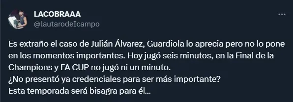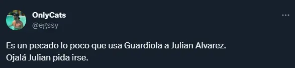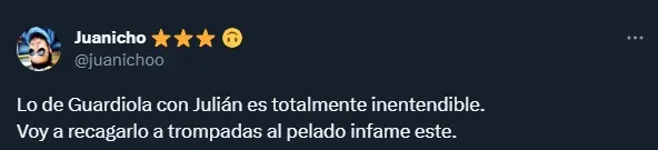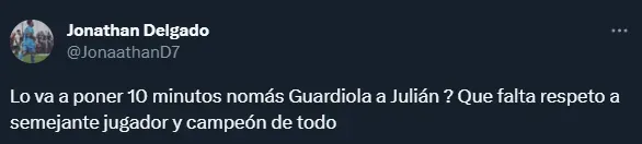 “Es totalmente inentendible” y “falta de respeto” son algunos de los comentarios más repetidos en Twitter contra la figura de Guardiola. Otros hasta piden que Julián se vaya a otro equipo, viendo que el entrenador de Manchester City no lo pone en partidos importantes.
