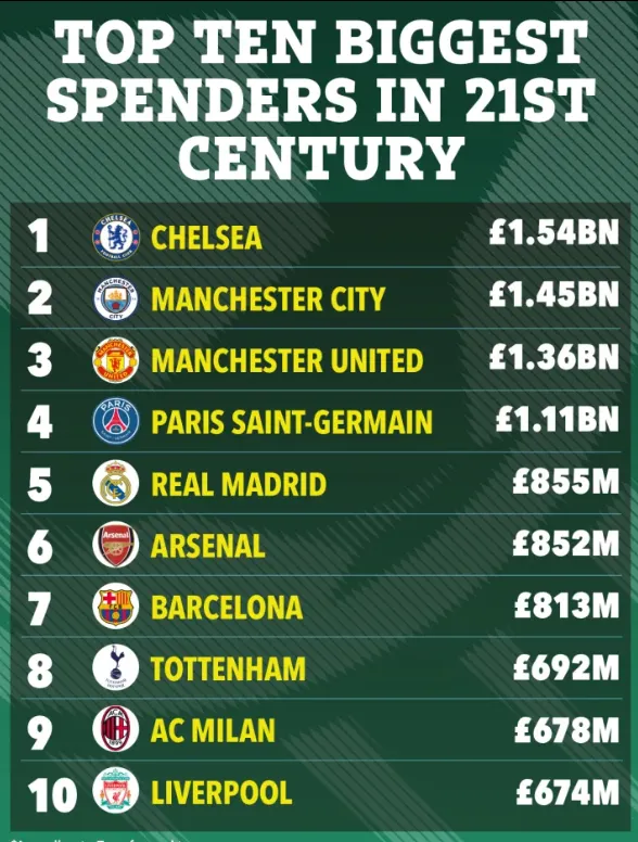 Más abajo en la lista aparecen PSG (1.11 billones), Real Madrid (855 millones), Arsenal (852 millones), FC Barcelona (813 millones), Tottenham (692 millones), AC Milan (678 millones) y Liverpool (674 millones. De esta manera, el listado queda conformado por 6 equipos de la Premier League, 2 de LaLiga, uno de la Serie A y uno de la Ligue 1.