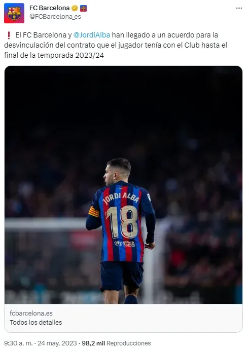 El club ha informado este 24 de mayo que ha llegado a un acuerdo con Jordi Alba para poner fin al contrato un año antes de lo esperado. “El FC Barcelona y Jordi Alba han llegado a un acuerdo para la desvinculación del contrato que el jugador tenía con el Club hasta el final de la temporada 2023/24“.