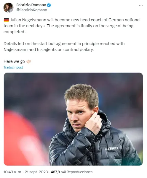 Según informa Fabrizio Romano, el acuerdo está hecho. La DFB aún no llega a un acuerdo con la totalidad del staff, pero restarían solo detalles para poder hacer oficial la contratación. Se espera que en los próximos días se confirme a Nagelsmann como seleccionador.