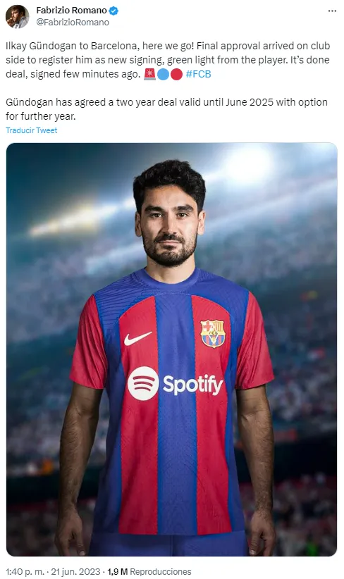 El periodista, Fabrizio Romano ha confirmado el acuerdo entre las partes. Ilkay Gündogan firmará en libertad de acción con FC Barcelona, a falta del anuncio oficial del club azulgrana.