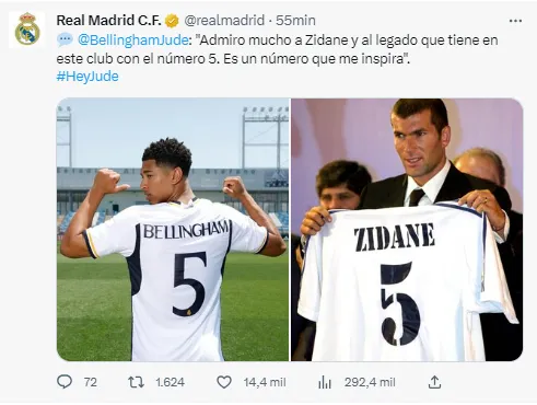 Bellingham reveló que la elección del número tuvo que ver por su fanatismo por una de las más grandes leyendas de la ‘Casa Blanca0’. “Lo he dicho en varias entrevistas todo lo que admiro a Zidane. Me inspira“.