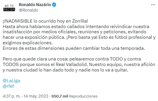 “¡INADMISIBLE lo ocurrido hoy en Zorrilla! Hasta ahora habíamos estado callados intentando reivindicar nuestra insatisfacción por medios oficiales, reuniones y peticiones, evitando hacer una exposición pública. ¡Pero basta ya! Esto es fútbol profesional y exigimos explicaciones. Errores de estas dimensiones pueden cambiar toda una temporada“, comenzó explicando el exdelantero brasileño en su cuenta de Twitter.