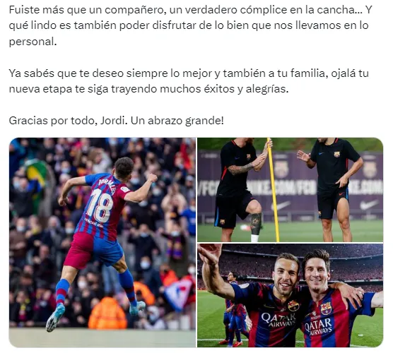 Además, Lionel Messi, en su escrito para Jordi Alba (de quien se desconoce hasta el momento en dónde continuará su carrera post proceso en el FC Barcelona), agregó: ”Ya sabés que te deseo siempre lo mejor y también a tu familia, ojalá tu nueva etapa te siga trayendo muchos éxitos y alegrías. Gracias por todo, Jordi. Un abrazo grande!”.