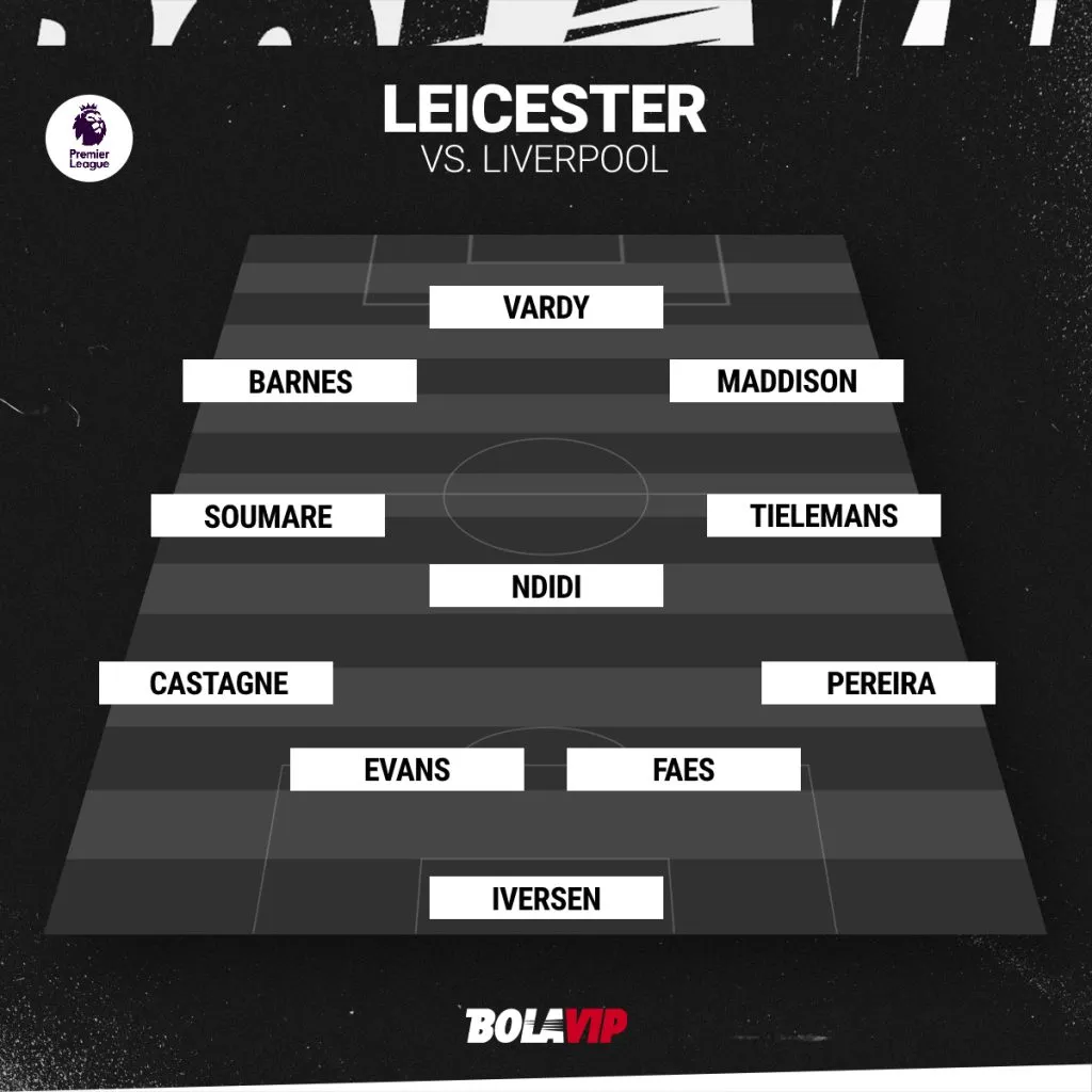 Daniel Iversen; Ricardo Pereira, Wout Faes, Jonny Evans, Timothy Castagne; Youri Tielemans, Wilfred Ndidi, Boubakary Soumare; James Maddison, Jamie Vardy y Harvey Barnes.