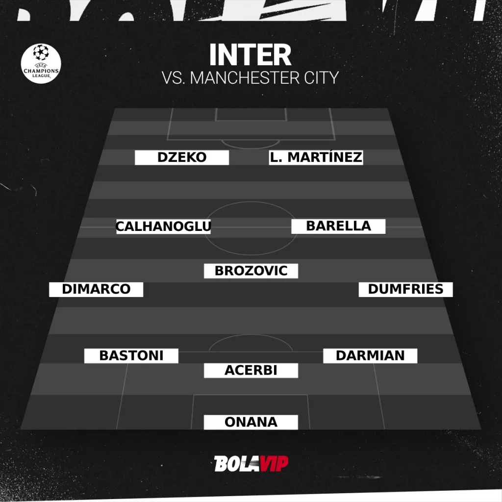 Inter sale al campo del Estadio Olímpico Atatürk con André Onana; Matteo Darmian, Francesco Acerbi, Alessandro Bastoni; Denzel Dumfries, Nicolò Barella, Marcelo Brozovic, Hakan Calhanoglu, Federico Dimarco; Lautaro Martínez y Edin Dzeko.