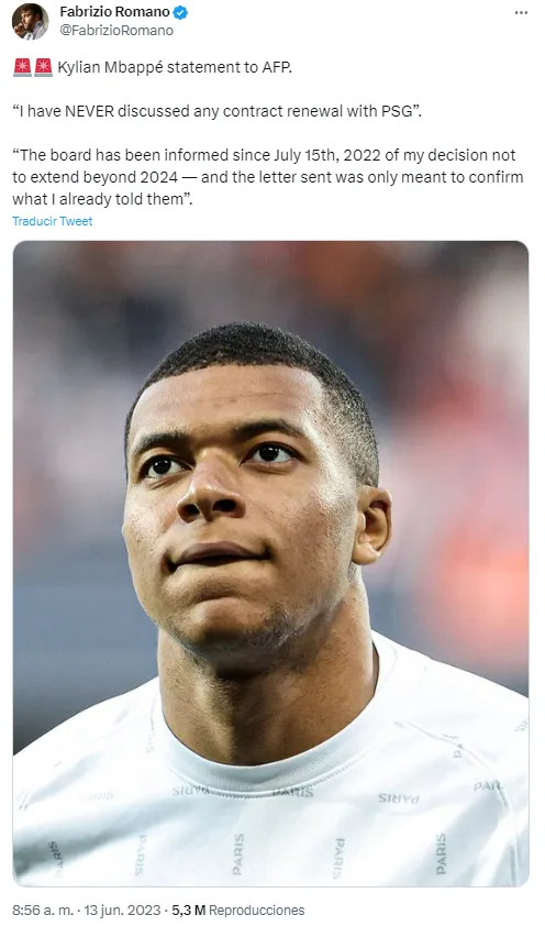 AFP ha replicado un comunicado del jugador, en el que confirma que su relación con el club parisino está prácticamente rota. “Nunca discutí con el PSG la renovación de contrato” fueron las palabras de Mbappé.