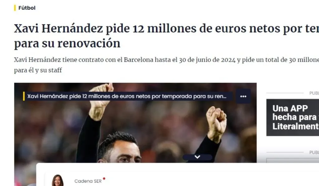 La Cadena SER habla de una importante diferencia ahora mismo entre el DT y Joan Laporta a la hora de pensar en una extensión de contrato. 30 de junio del 2024 marca ahora mismo la diferencia entre ambas partes para una renovación ganada por Xavi en el césped y que incluye una importante aumento. Ahora mismo el de Terrassa recordemos, cobra montos cercanos a los 3.8 millones de euros.