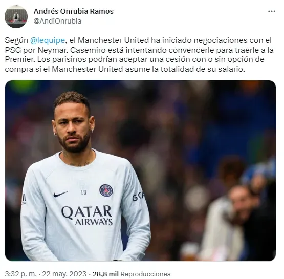 Según el periodista Andrés Onrubia, de As, Manchester United ya está en conversaciones con PSG por el sudamericano. Al mismo tiempo, Casemiro, compañero de Neymar en la Selección Brasileña y volante de los Diablos Rojos, intenta convencer a su compatriota de que presione para que se haga realidad el movimiento.