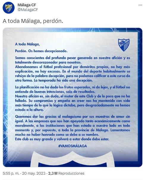 A toda Málaga, perdón, os hemos decepcionado. Somos conscientes del profundo pesar generado en nuestra afición y es totalmente descorazonador para nosotros. Abandonamos el fútbol profesional por deméritos propios, no hay más explicación, no hay más excusas. En el mundo del deporte habitualmente se rehúye de la palabra decepción, pero no podemos calificar a este curso de otra forma. La temporada ha sido una decepción” dice el comunicado de la entidad.