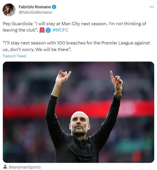 Aunque el contrato de Guardiola con Manchester City tiene vigencia hasta 2025, se especulaba con que el catalán se alejara del conjunto inglés este verano. Sin embargo, el periodista Fabrizio Romano publicó declaraciones del DT en las que asegura lo contrario: “Me quedaré en el Man City la próxima temporada. No pienso dejar el club“.