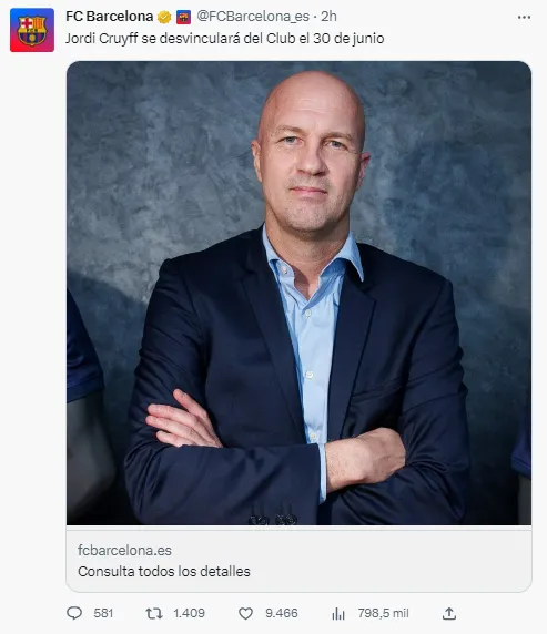 “En sus dos temporadas en el club catalán, la labor de Jordi Cruyff ha sido muy valiosa en las decisiones futbolísticas y en la reconstrucción del primer equipo. Además, ha sido un persona muy cercana a los entrenadores y el staff técnico que ha tenido el club” añadió el club azulgrana.