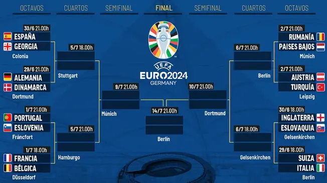 Es decir, por un lado de la llave, potencias como España, Alemania, Portugal, Francia y Bélgica se dirimirán un solo lugar en la Final que se llevará a cabo en el Estadio Olímpico de Berlín el próximo 14 de julio. Por el otro, se presume que Inglaterra e Italia podrían revivir la Final de la edición 2020 (jugada en 2021), pero en los Cuartos de Final.4