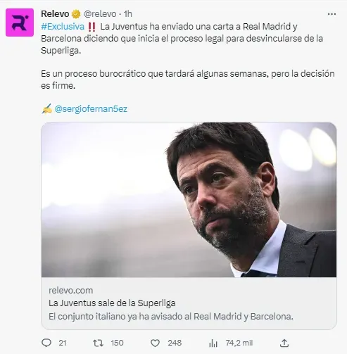 El equipo italiano cambió toda su plana mayor tras el escándalo de las plusvalías. El entonces presidente, Andrea Agnelli era una de las cabezas detrás de la Superliga. Sin embargo, este renunció a su cargo y ha sido inhabilitado.