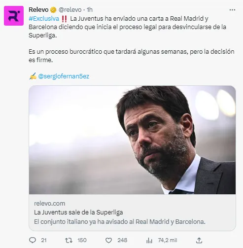 Según informa Relevo, Juventus ha enviado cartas a Real Madrid y FC Barcelona para informar el inicio del proceso legal para desvincularse de la Superliga. A la espera de la decisión de los tribunales europeos, los clubes españoles son los únicos que quedan en pie.
